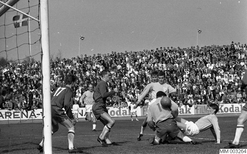 Allsvensk match, Malmö FF - Örgryte IS (5-1), på Malmö Stadion 1968-04-21. Anders "Puskas" Ljungberg i kamp med Örgrytes målvakt Åke Bergling med assistans av Harry Jönsson och Dag Szepanski.