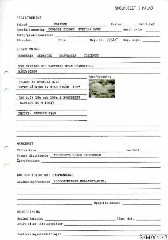 Hermelin, Åkersork, Småvessla, Igelkott, med hängare och kantband, utan hörnskydd. Bilder av svenska djur efter målning av Nils Tirén 1927. (Se s. 74 18a och 103a i Norstedts katalog no 9 1924.