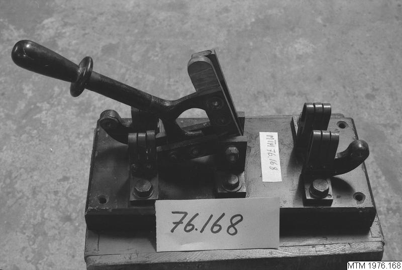 Knivströmbrytare. Kraftigt utförande med fjäderbelastning. Monterad på en svart träplatta märkt 2D.