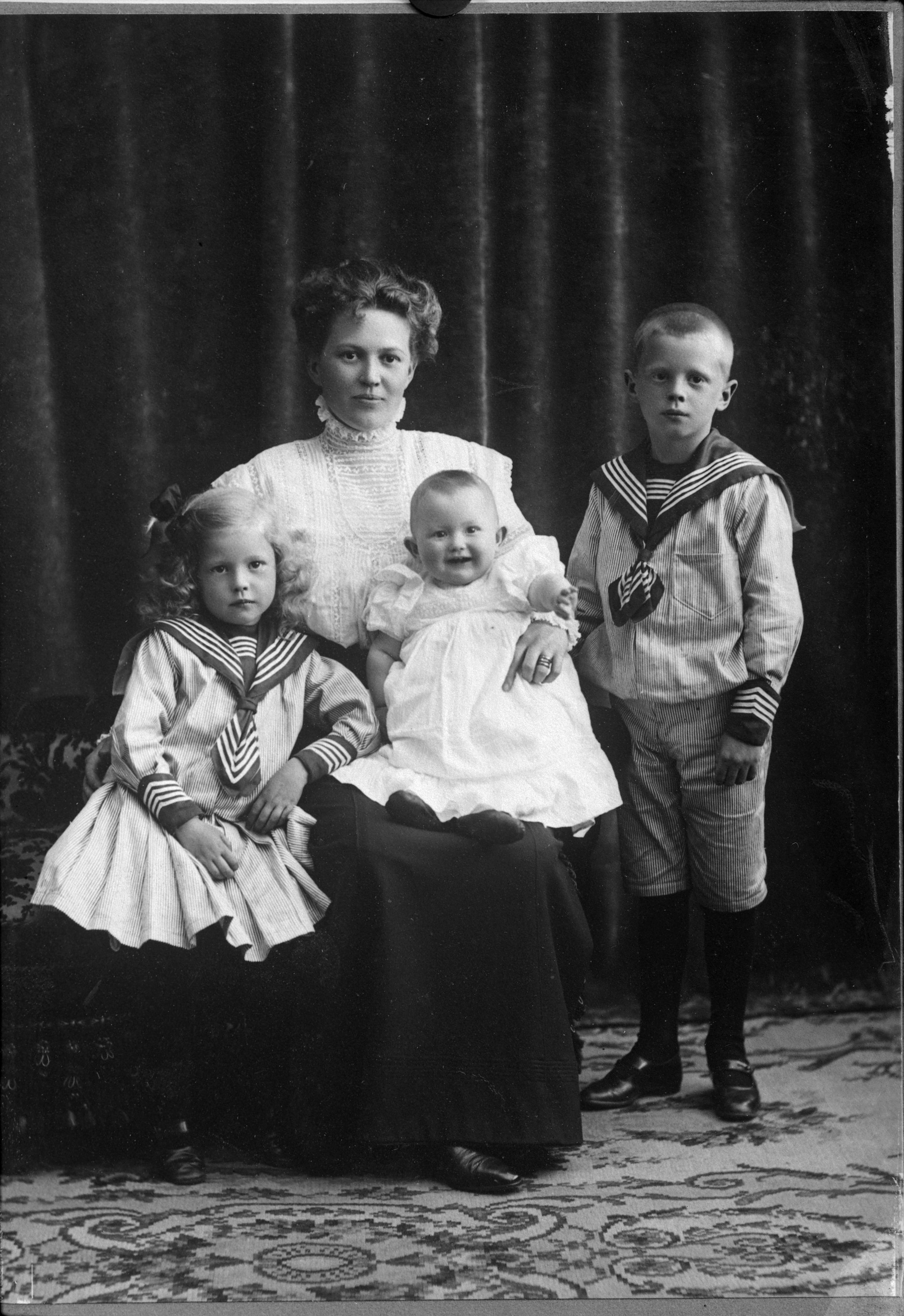 Porträtt i helfigur av fru Gundersson med sina barn. Sonen och dottern iklädda sjömanskostym och dottern med rosett i håret. Yngsta barnet sittande i moderns knä.