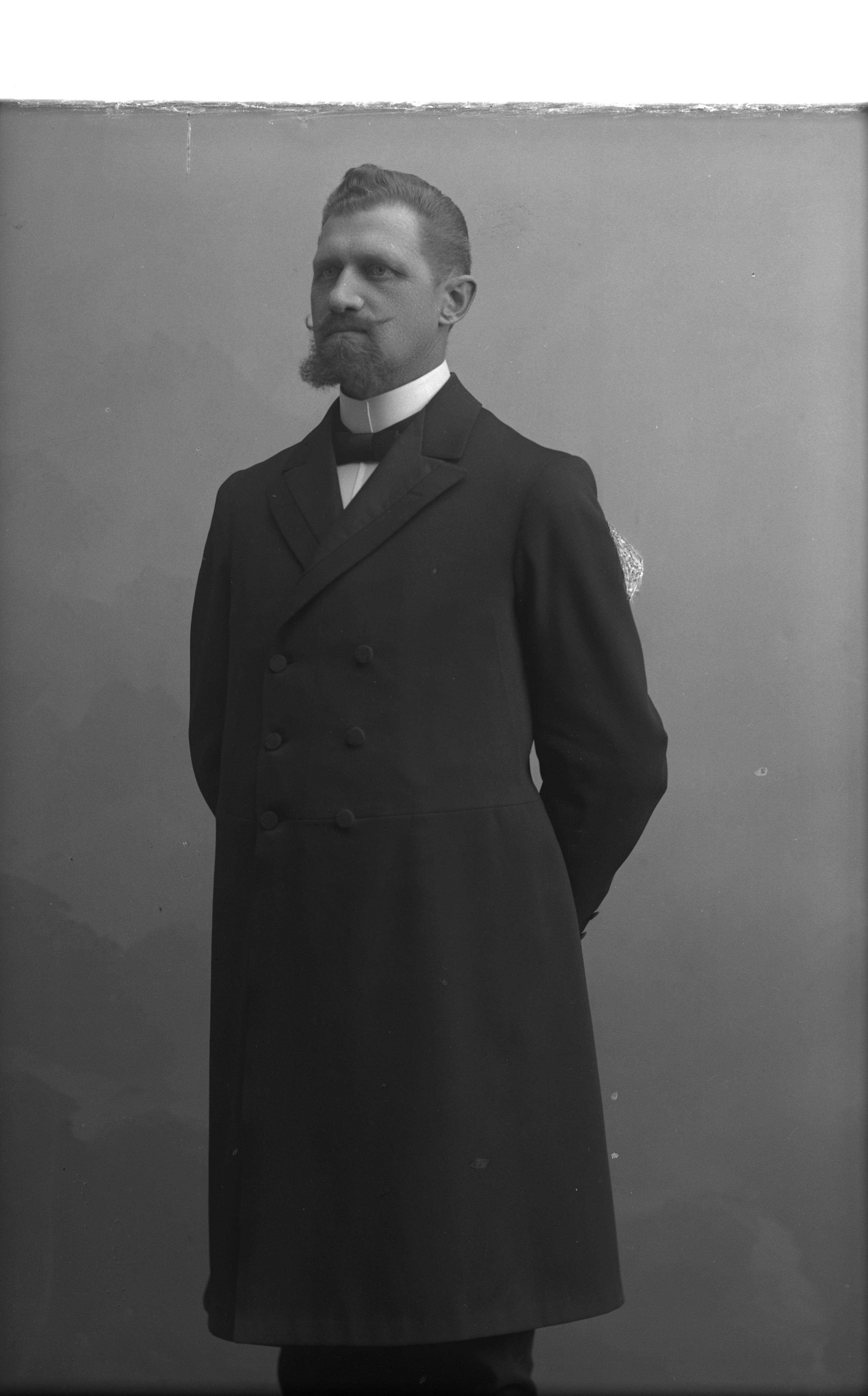 Porträtt i helfigur av mejeridisponent Carl Georg Westrup, iklädd ytterrock.