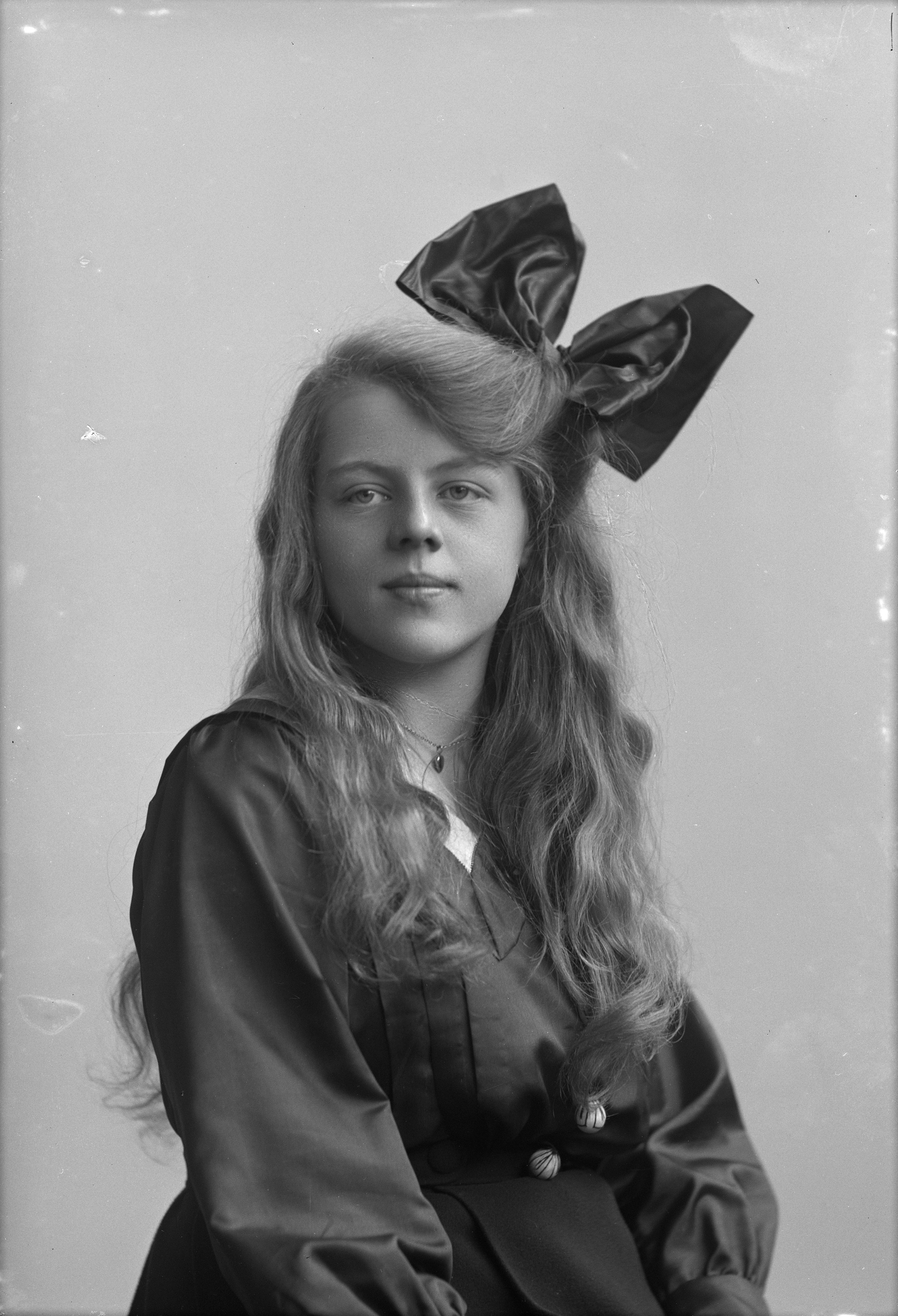 Porträtt i halvfigur av grevinnan von Essens yngsta dotter med stor rosett i håret.