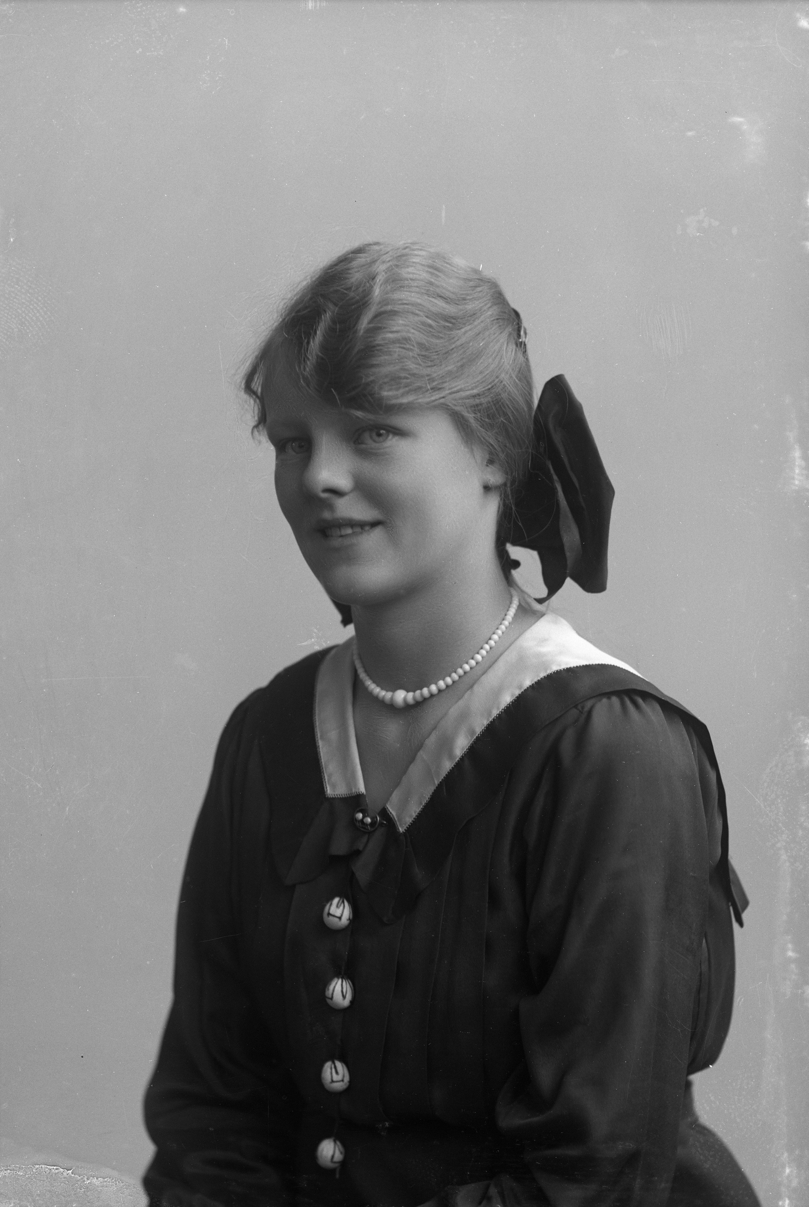 Porträtt i halvfigur av grevinnan von Essens äldsta dotter med stor rosett i håret.
