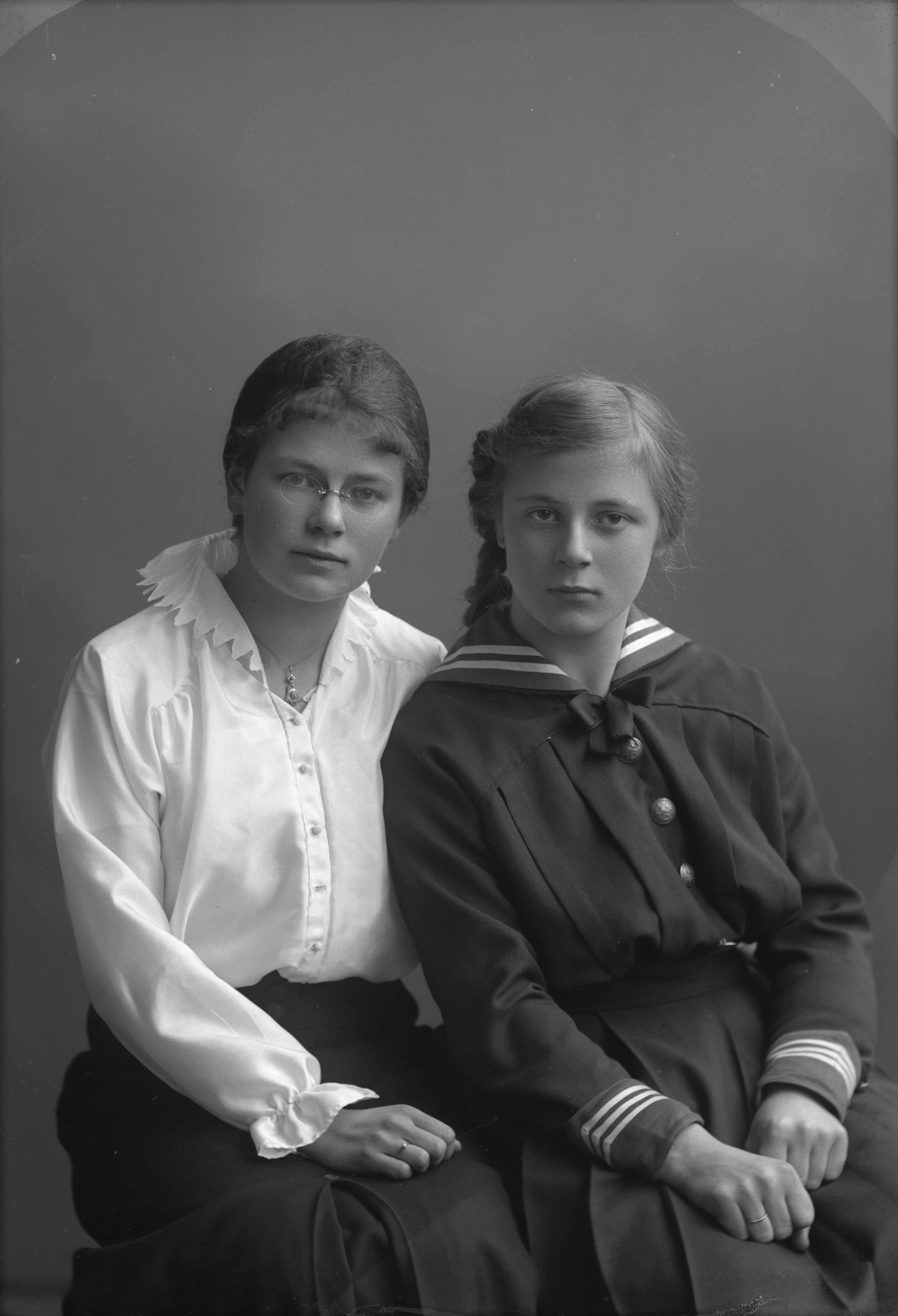 Porträtt i helfigur av Elsa Ohlsson i sällskap med en okänd kvinna.