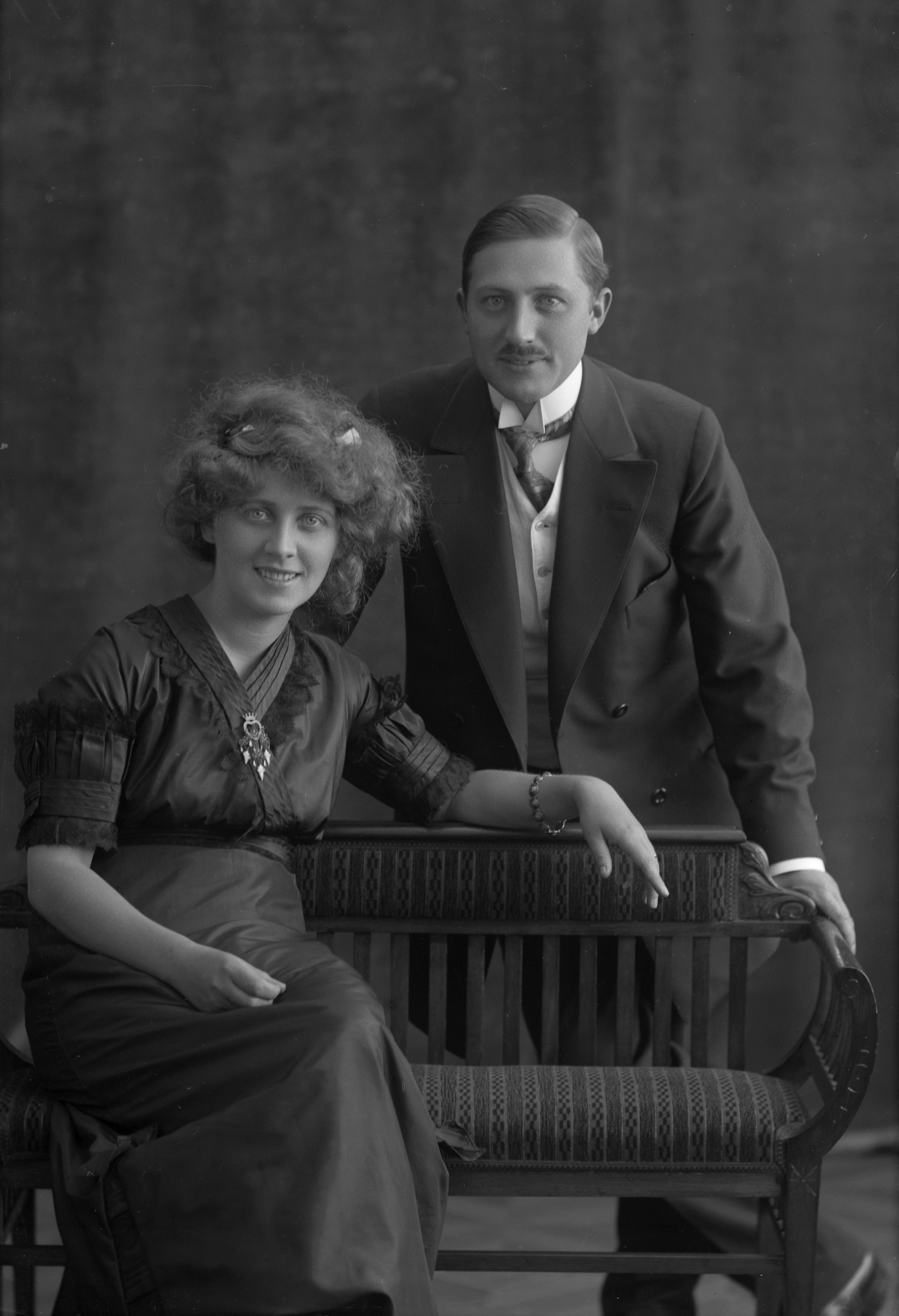 Porträtt i helfigur av kammarskrivare Oskar Elmqvist med fästmön Ida Olivia Johansson.