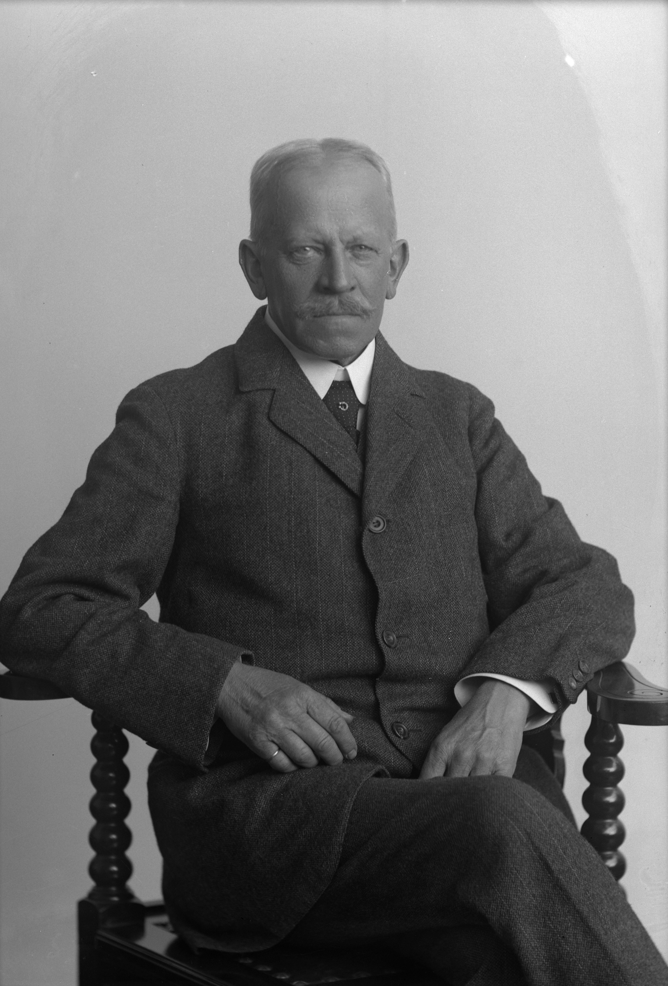 Porträtt i helfigur av greve Beck-Friis, sittande i stol.