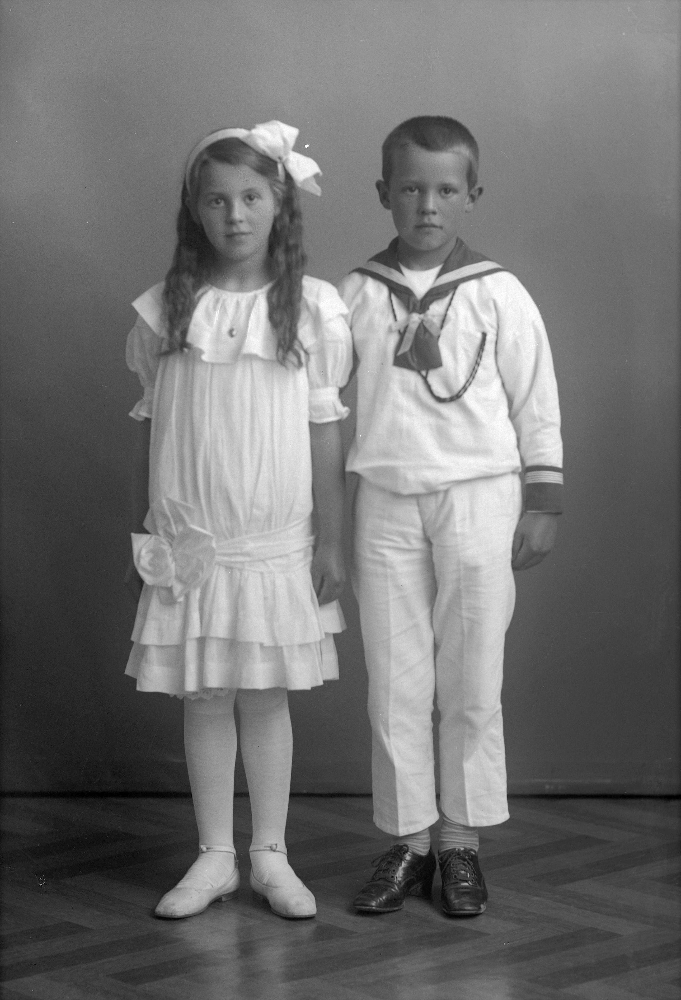 Porträtt i helfigur av Jöns Larssons son och dotter, Anna Birgit Cecilia och Bengt Sture Weinberg.