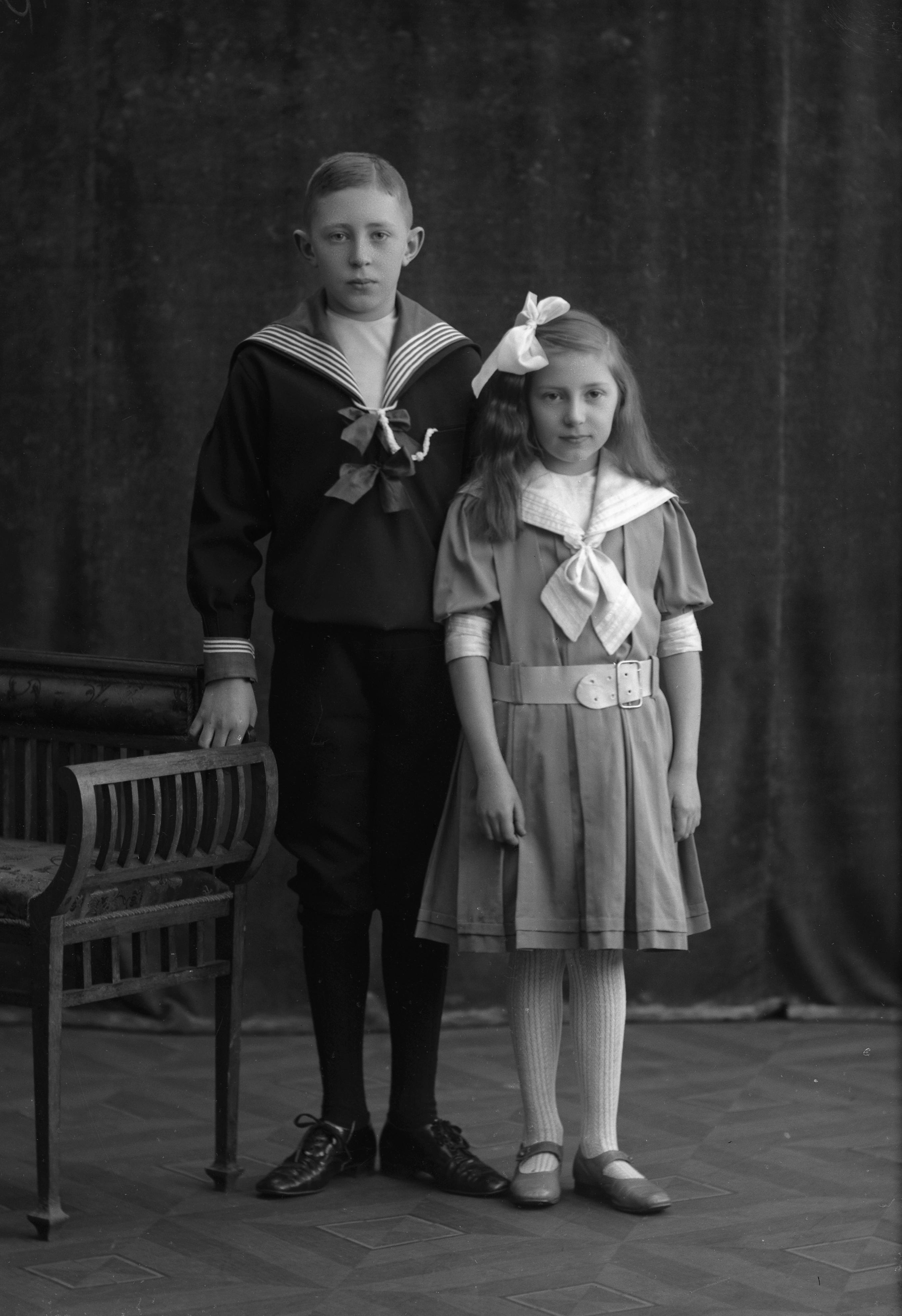 Porträtt i helfigur av Valfried Anderssons son och dotter, stående tillsammans vid bänk. Sonen klädd i sjömanskostym, dottern med stor rosett i håret.