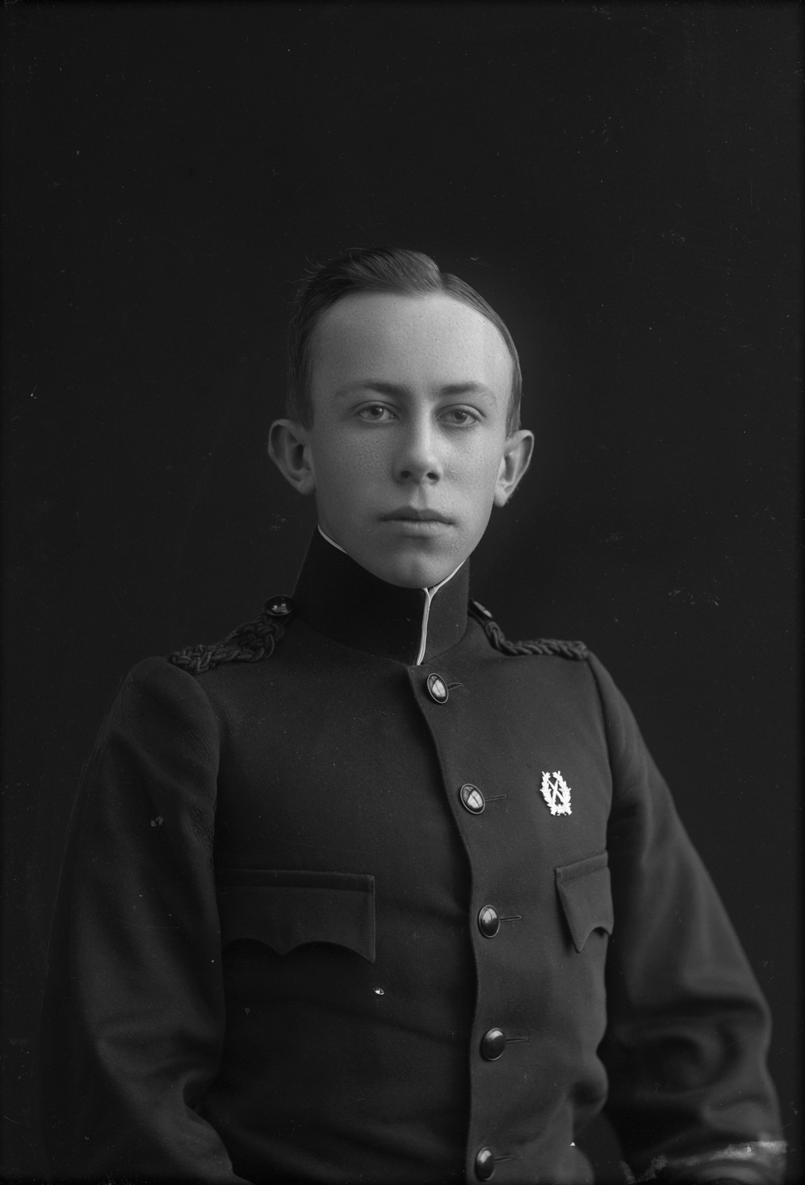 Porträtt i halvfigur av soldaten Lindberg i militäruniform.