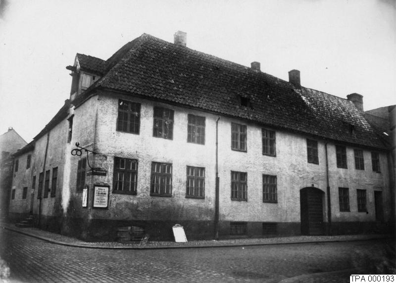 Gatubild.Knutsgillets hus på hörnet av Västergatan och Gråbrödersgatan i kvarteret Gråbröder. Jfr. TPA000188-000192. Repro av äldre foto.