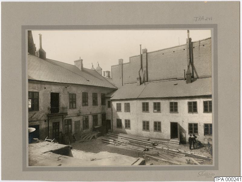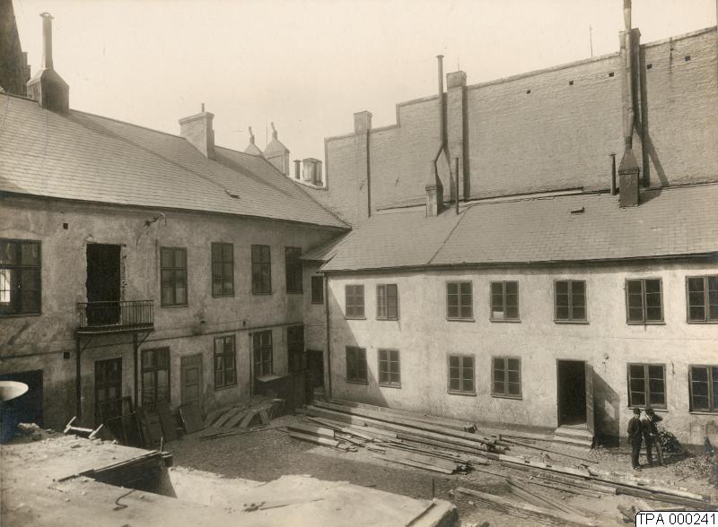 Gårdsinteriör, Östergatan 39 som revs 1916 (tornet på S:t Petri kyrka skymtar längst till vänster i bild).