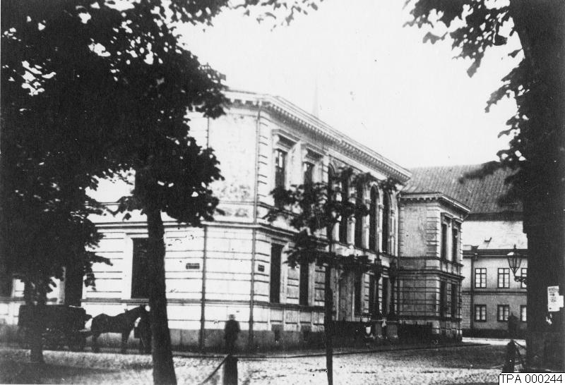 Gatubild. Repro efter äldre foto. Hörnet av Norra Vallgatan och Bruksgatan. Skånes Enskilda Bank i kvarteret Kronan. Efter ett äldre foto.