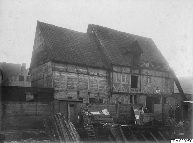 Rivning av byggnad tillhörande apoteket Lejonets gård vid Mäster Johansgatan i kvarteret Lejonet. Jfr. TPA 246-255 är varianter på ungefär samma tema. Fotografen står i kvarteret Rosen.