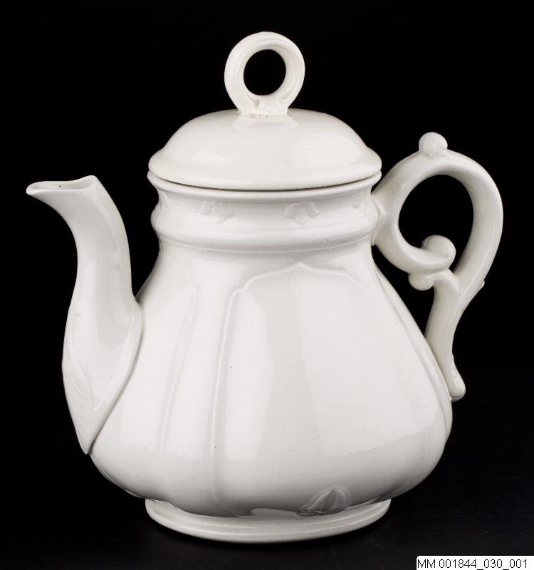 Tekanna i flintgods. Vit med stiliserade blad vid mynningen och fotringen i relief, sirligt utformad lodgrepe. Locket med cirkelformat handtag.