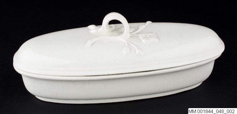 Tandborstkopp i flintgods.Oval form med lock, vilket är dekorerat med blommor i relief och ett blad är format till handtag.