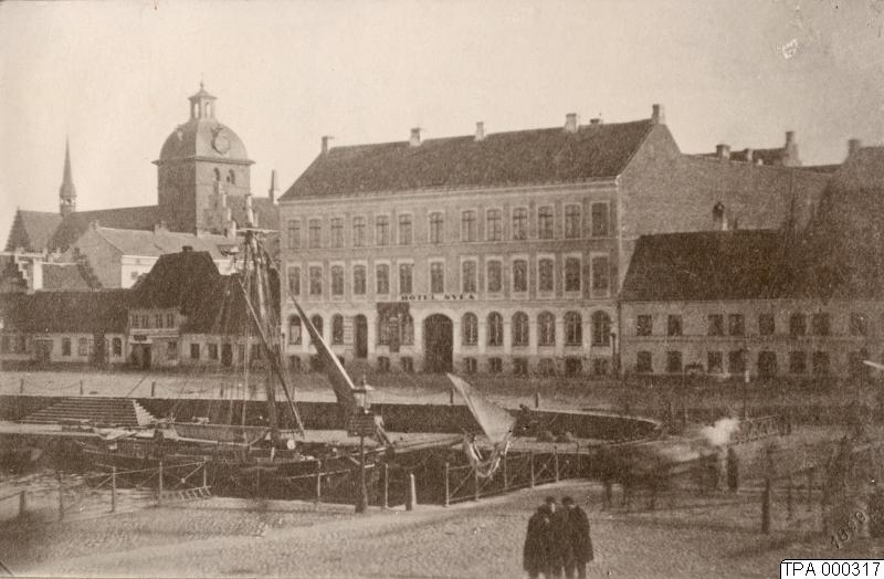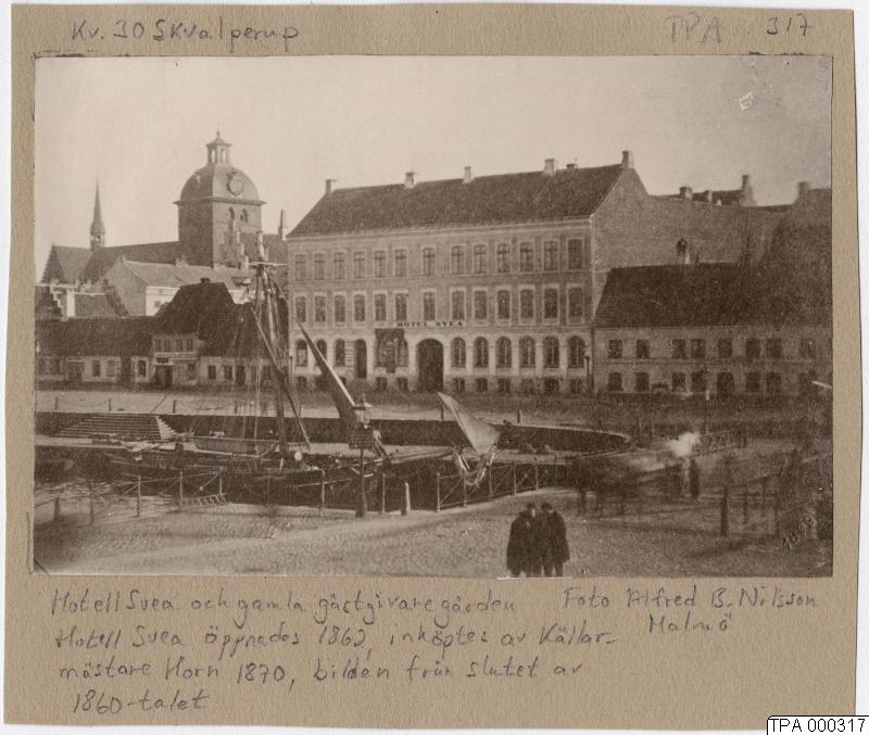 Norra Vallgatan vid Järnvägshamnen, Hotel Svea. Repro efter äldre bild, kopia 1899.