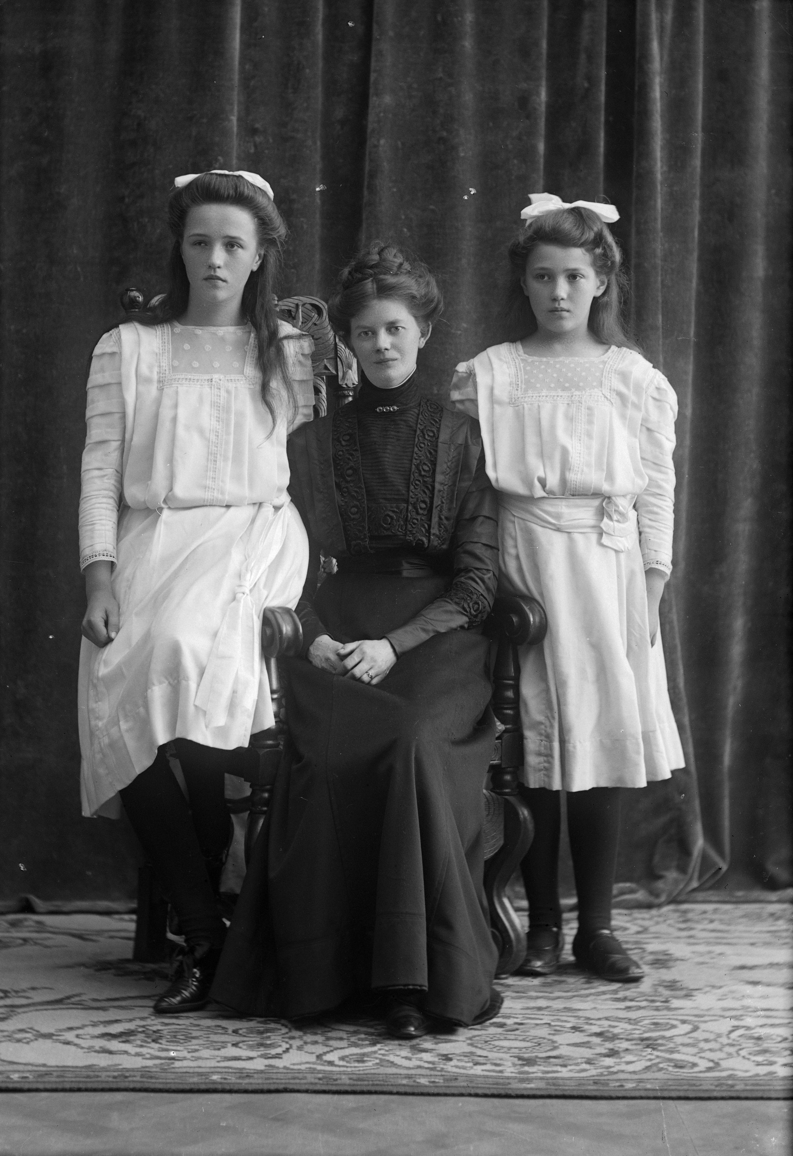 Porträtt i helfigur av förgyllerskan Blenda Winberg med, sannolikt, två av sina yngre systrar.