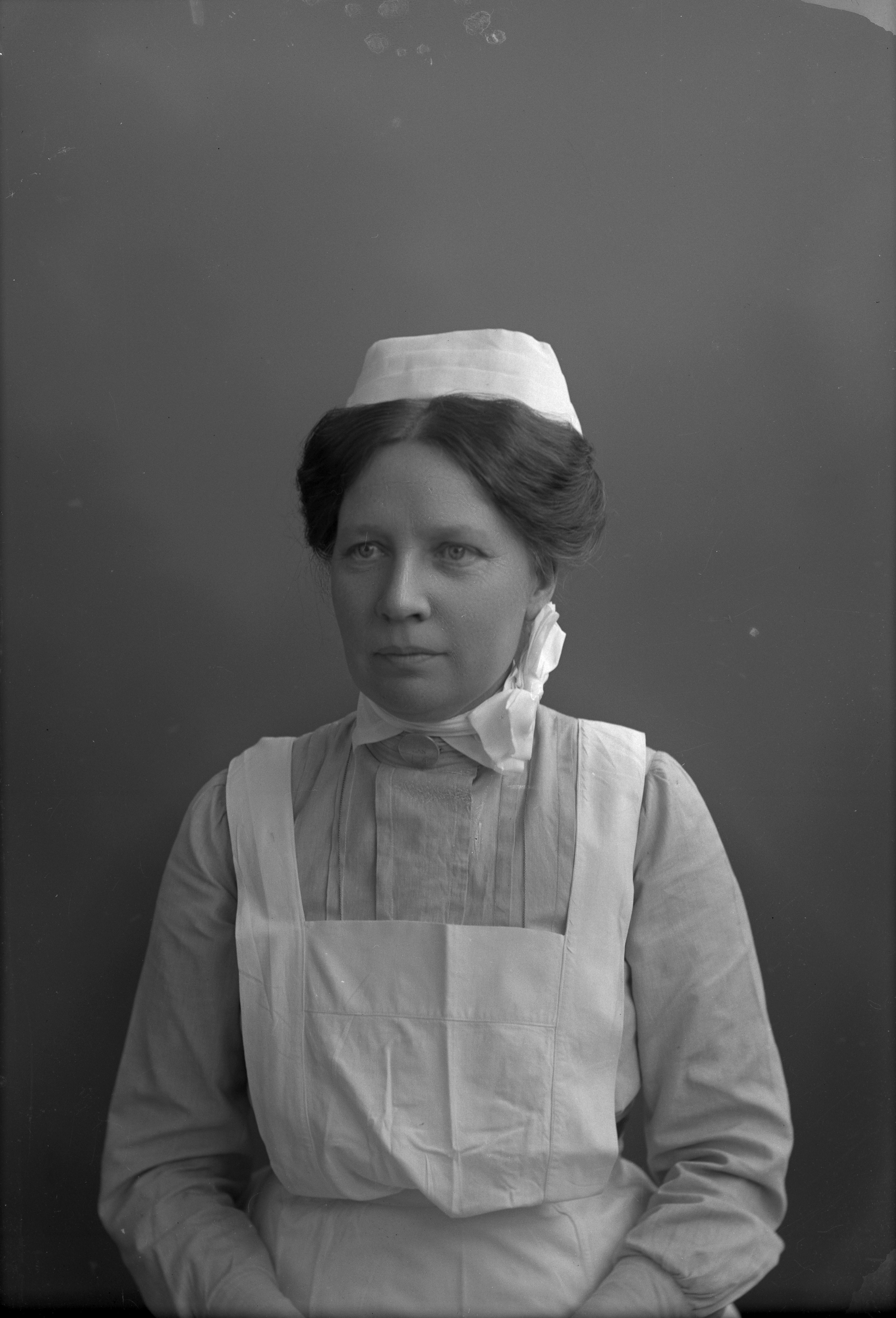 Porträtt i halvfigur av Nanny Carlsson, iklädd sjuksköterskeuniform.