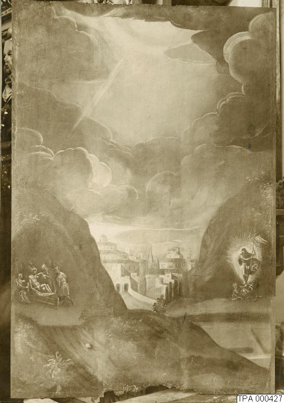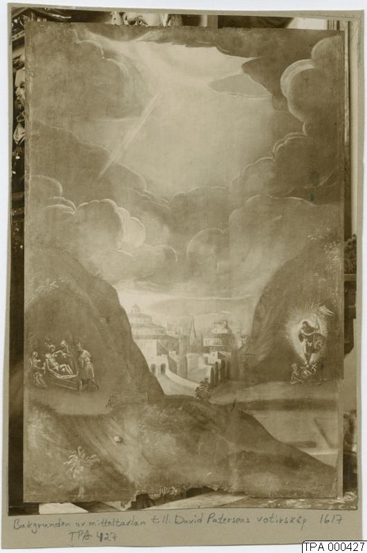 Målning (bakgrunden enligt påskrift) från David Petersens votivskåp i S:t Petri kyrka (1617).