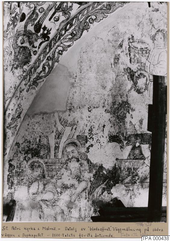 S:t Petri kyrka. Detalj av "Blodsoffret". Målning på södra väggen i Dop/Krämarkapellet. 1500-talets första årtionde.