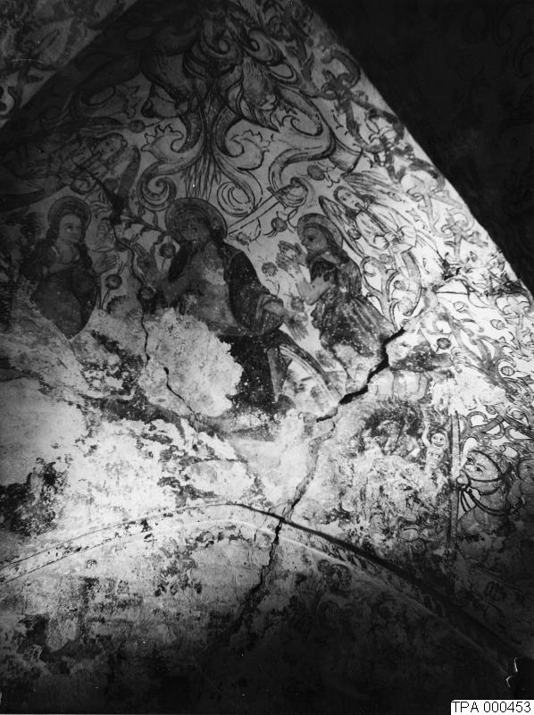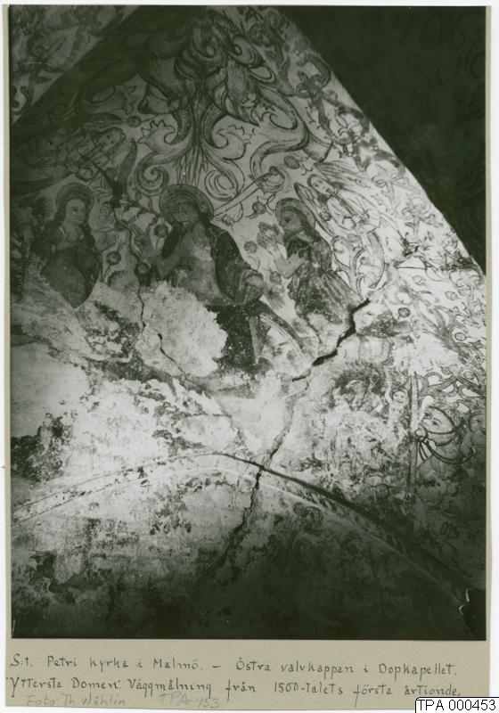 S:t Petri kyrka. Detalj av väggmålning i Dop/Krämarkapellet från 1500-talets första årtionde. Östra valvkappan, "Yttersta domen".