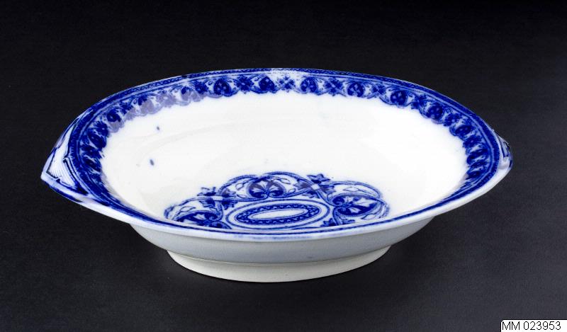 Karott i flintgods, spetsoval form med utdragna kanter med spetsiga skivhandtag. Vit med en bård med bladornament i mörkblått (koppartryck) på brättet, mönster med rankor och hjärtformade palmetter.