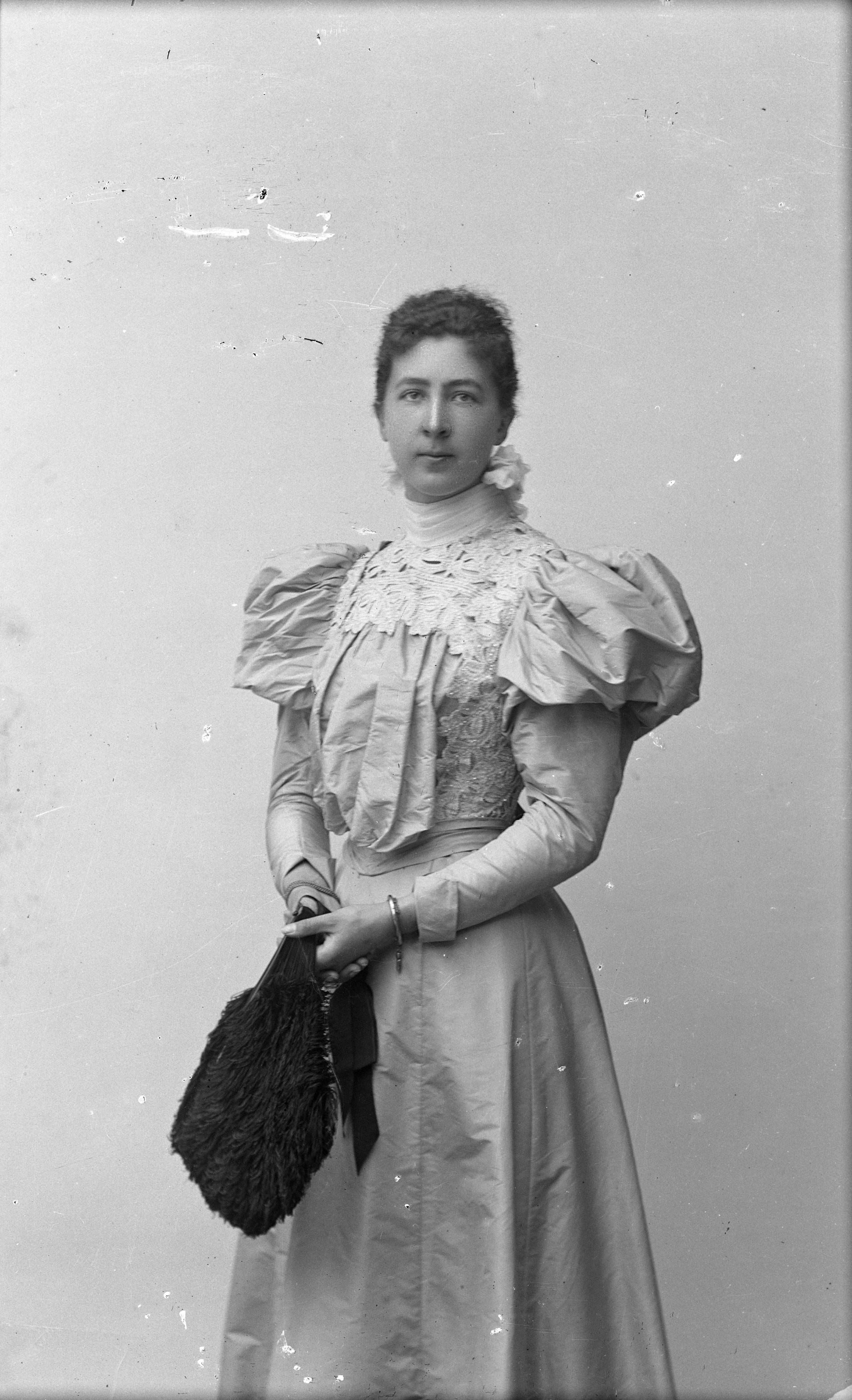 Porträtt i helfigur av grevinnan Wachtmeister med rosett i håret, hållande solfjäder.