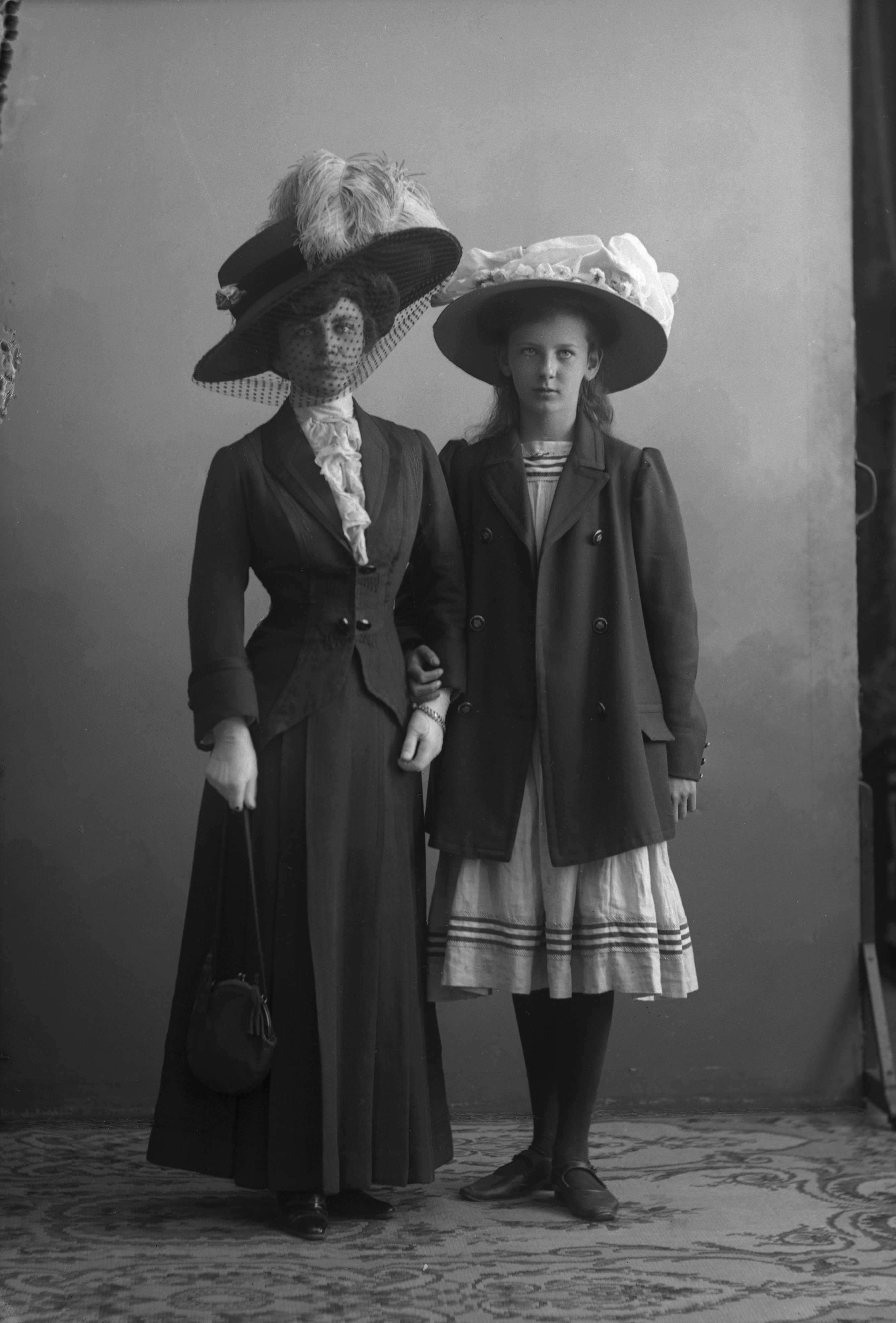 Porträtt i helfigur av fru Rüder med dotter, båda iklädda stora hattar, moderns med fjäderplym, och kappor. Modern även iklädd handskar och håller handväska.