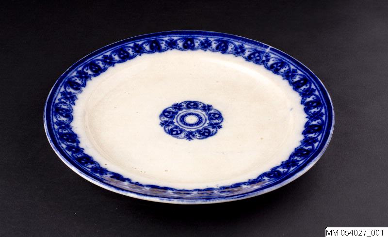 Fat i flintgods. Runt och vitglaserat med en bård med bladornament i blått koppartryck på brättet och på spegelns mitt, mönster med rankor och hjärtformade palmetter. Släta brätten.