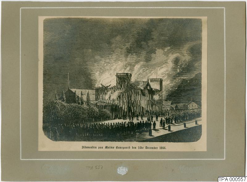 Xylografi: Brand på Malmö Bangård, 1866-12-14. Repro ur Illustrerad Tidende.