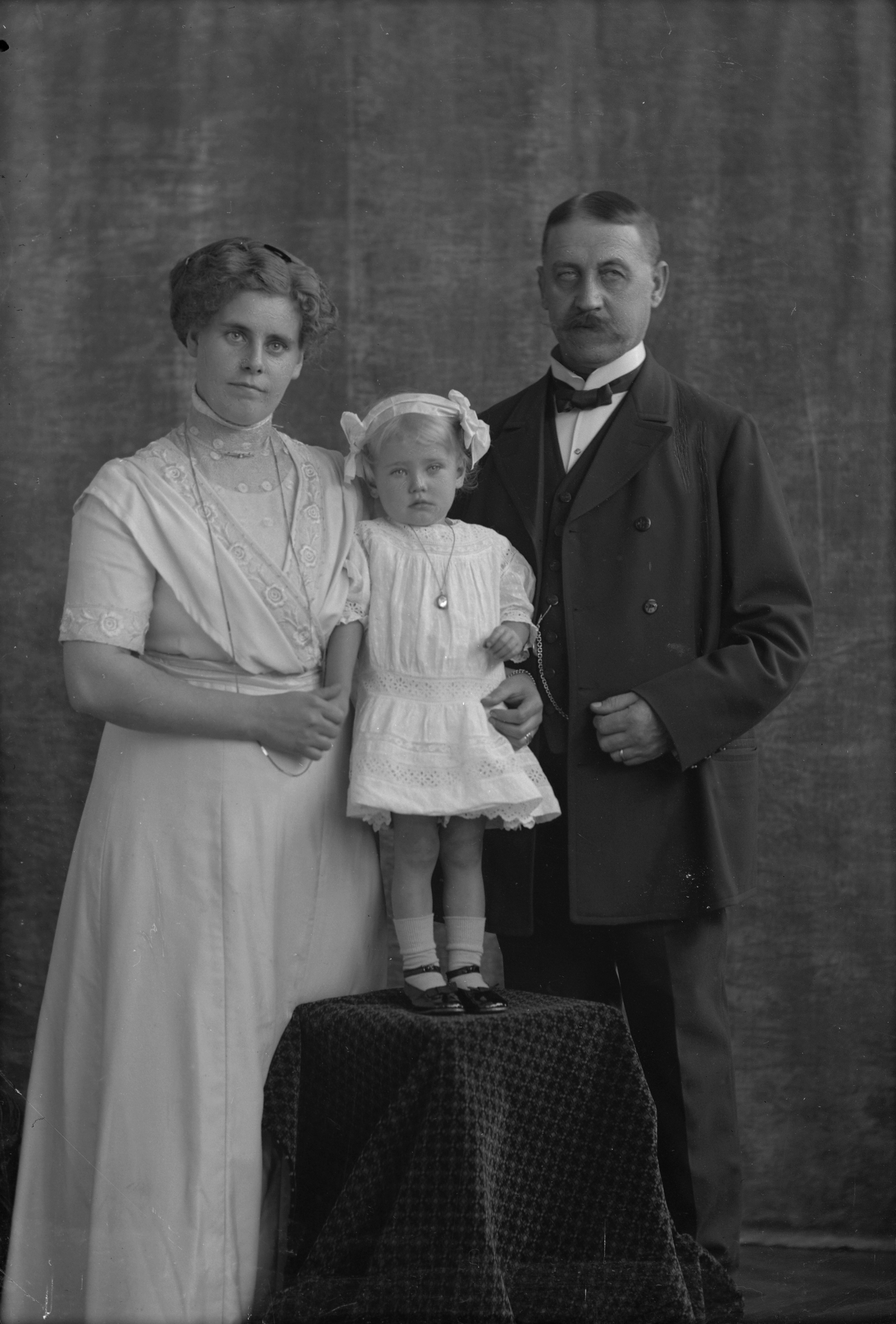 Porträtt i helfigur av handelsman Magnus Theodor Möller med familj, frun Elisabeth Natalia och dottern Greta Elisabeth. Dottern stående på piedestal mellan föräldrarna.