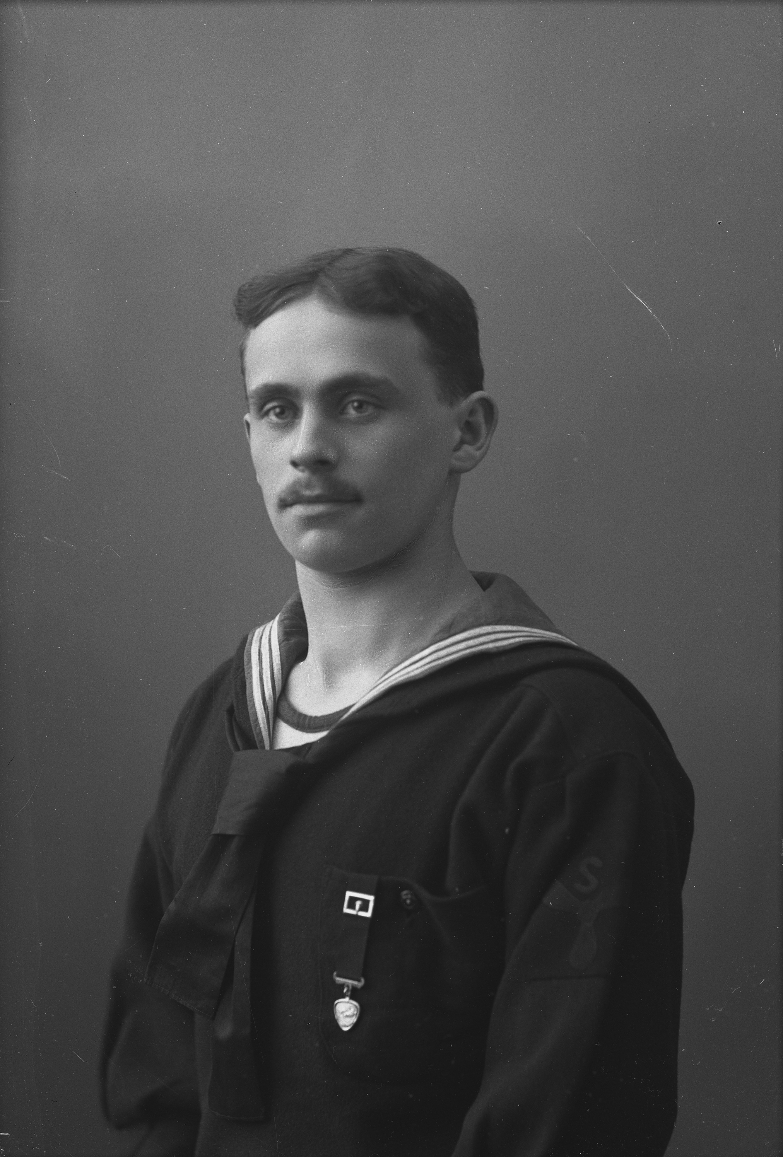 Porträtt i halvfigur av fartygseldare Andersson, iklädd sjömanskostym.
