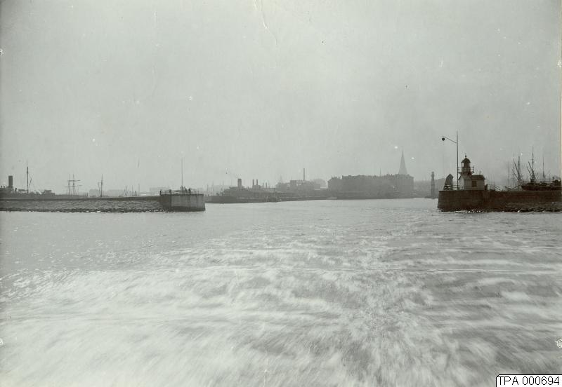 En båt lämnar hamnen. Vy akterut in mot staden.