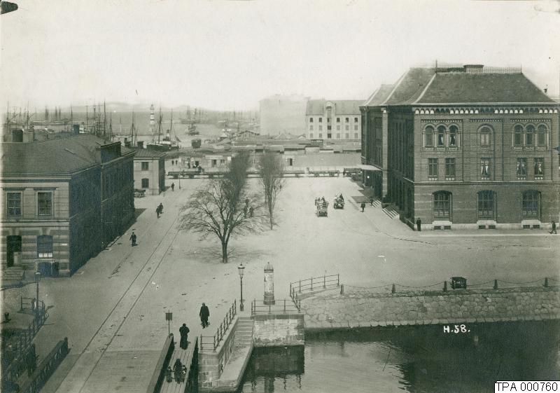 Tågstationen till höger och tullkammaren till vänster. Vy norrut mot hamnen. Bron i förgrunden är Mälarbron. Jfr. TPA 738 och 740.