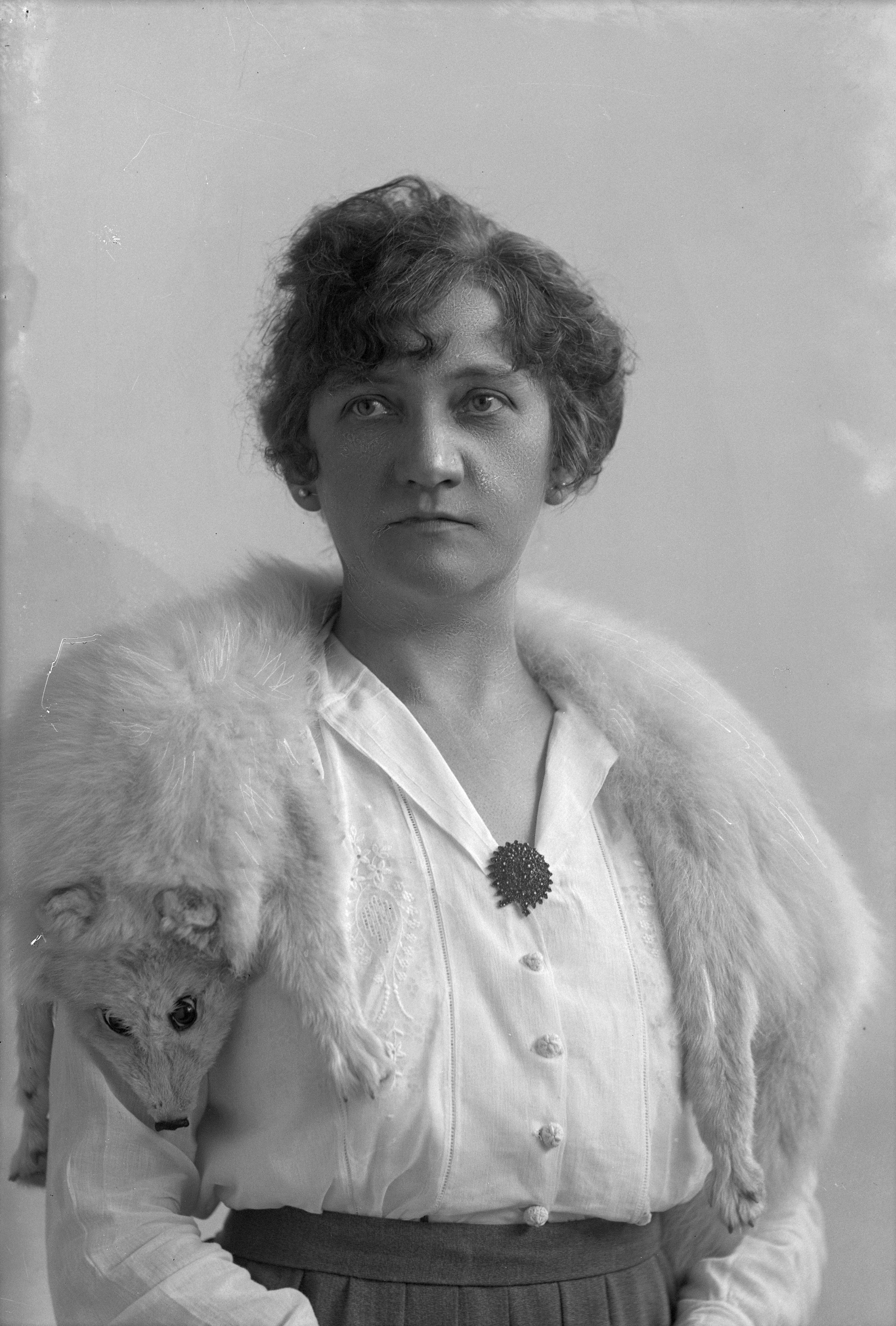 Porträtt i halvfigur av fröken Sandén med rävpäls.