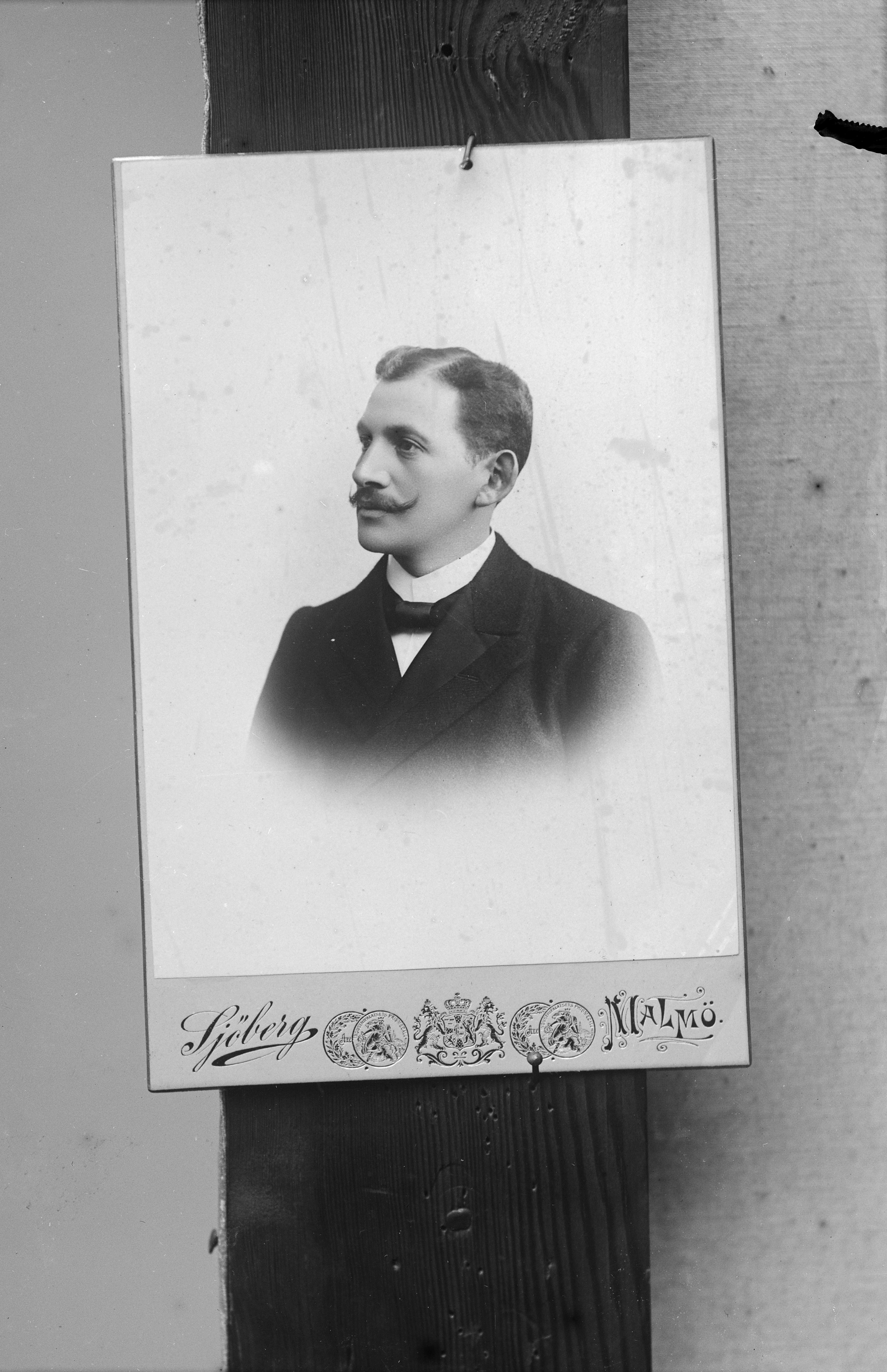 Porträtt i halvfigur av herr Piper. Visitkort med ateljélogotyp, "Axel Sjöberg /Malmö".