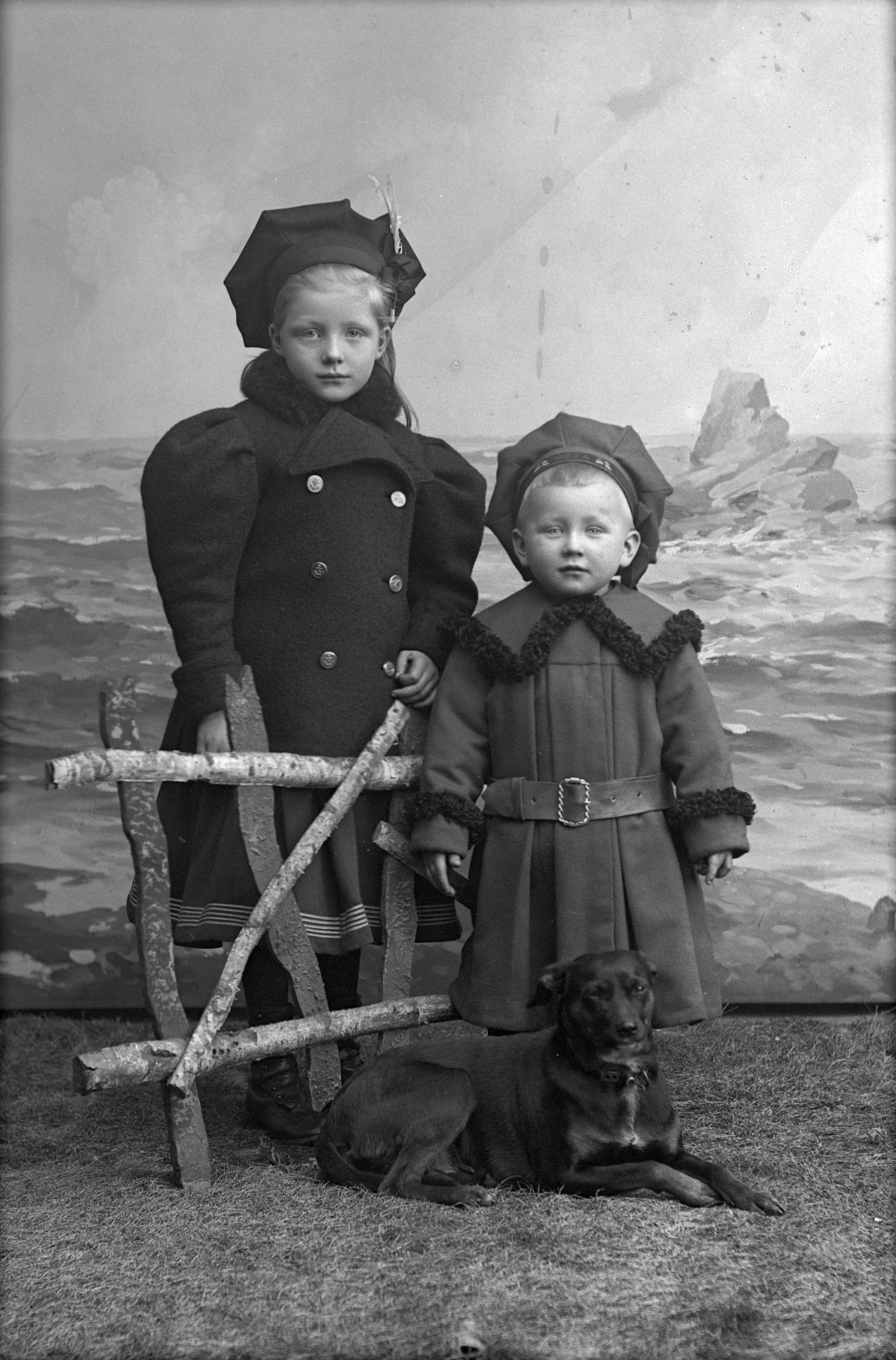 - Porträtt i helfigur av fru Tolléns son och dotter, stående vid staket, båda iklädda ytterkläder och mössa. Deras hund ligger framför staketet. Fotograferade framför ateljéfond.