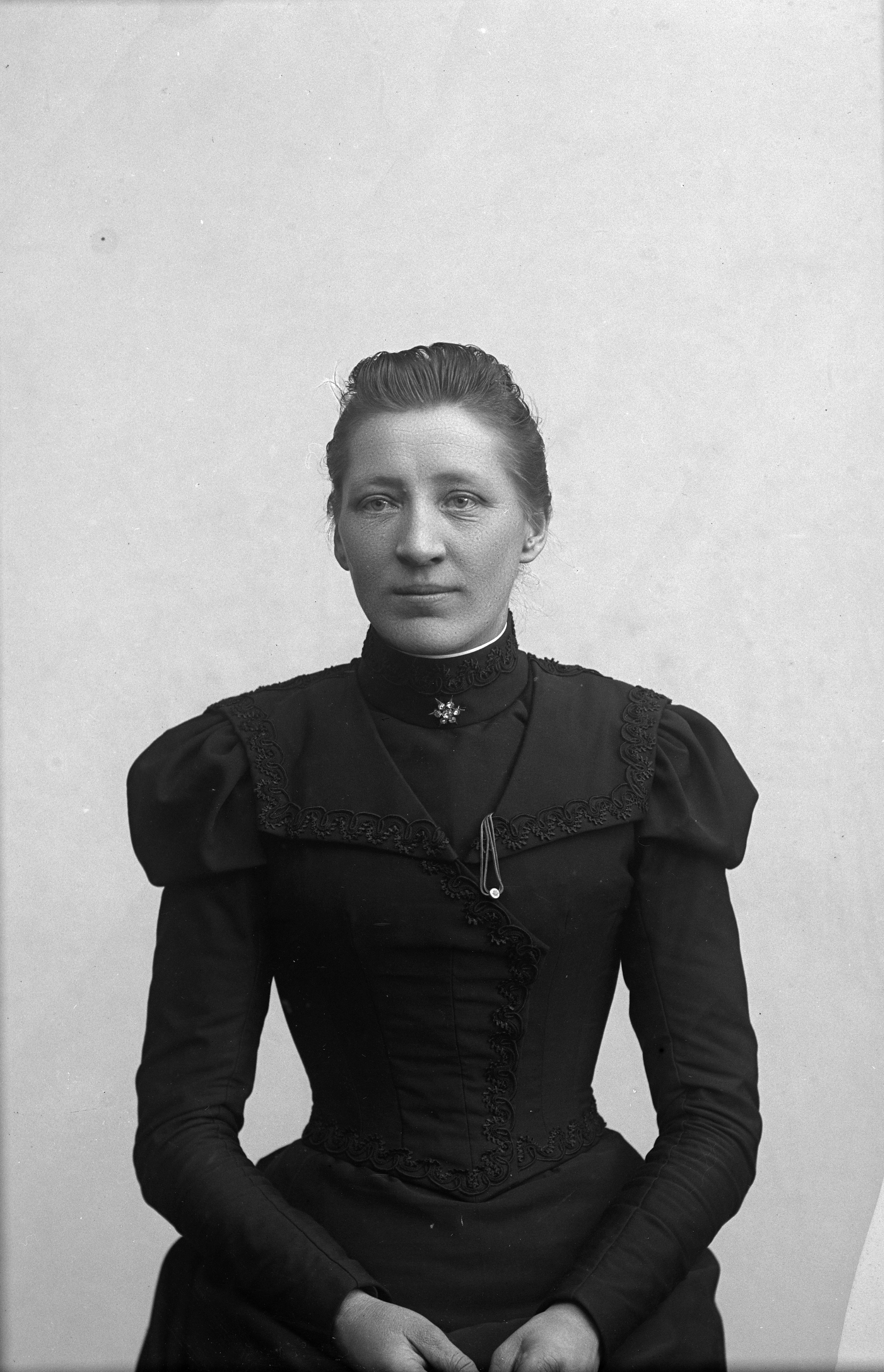 Porträtt i halvfigur av Sigrid Brorsson, väveriarbeterska.