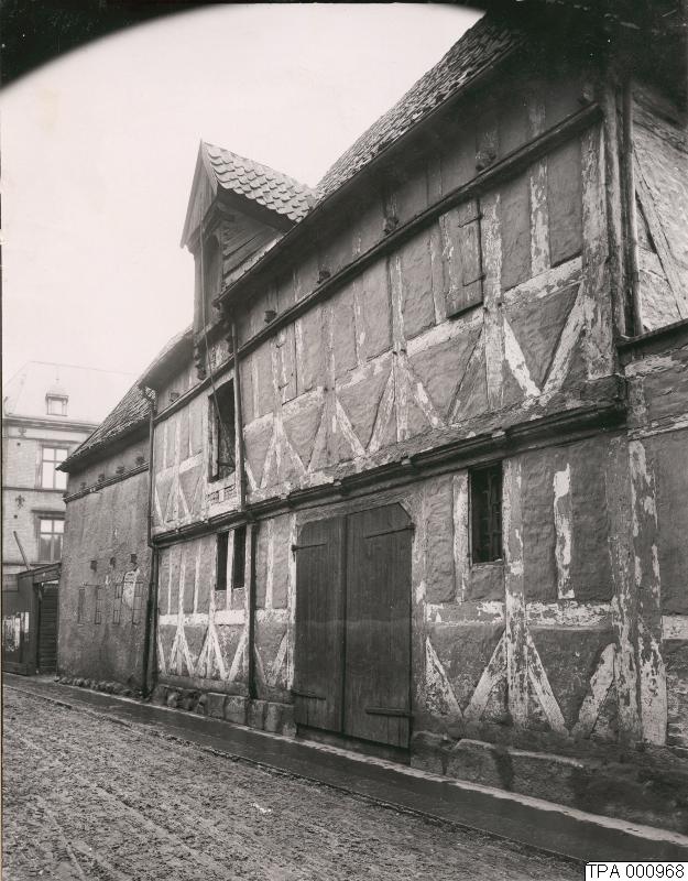 Gatubild med korsvirkeshus. Stämpel: Nordiska Museet Foto.