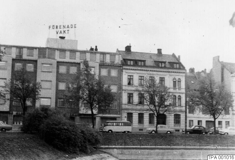 Norra Vallgatan och kvarteret Skepparen. Det låga huset till höger är Leon Fagercrantz hus och ateljé. Västra Hamnkanalen i förgrunden och en del av Bastion Älvsborg.
