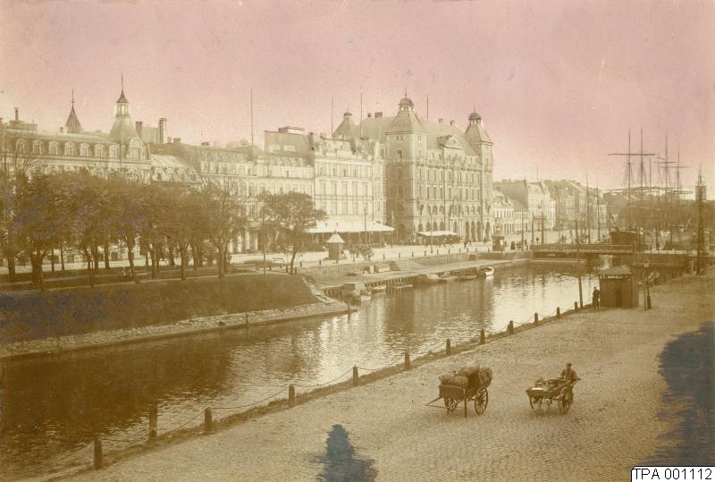 Gatubild. Östra Järnvägsgatan och den del av kanalen som hette Järnvägshamnen. Vy västerut mot Norra Vallgatan. Bron i fonden till höger är Mälarbron.