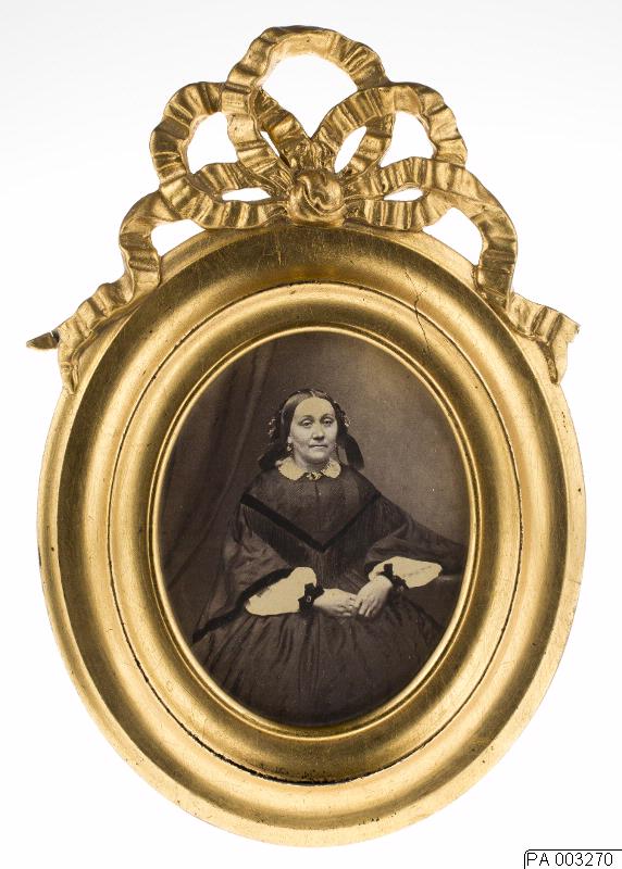 Porträtt av Benedicta Hansson, född Knutsson. Fotografi i förgylld träram. Fru till slaktarmästare Anders Hansson i Malmö.
