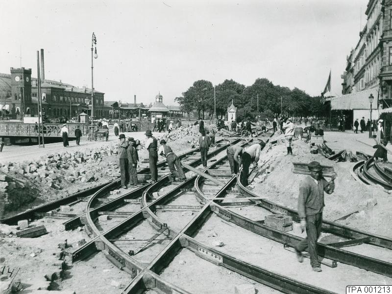 - Anläggningsarbete i samband med elektrifiering av spårvägen 1906-07. Norra Vallgatan. I bakgrunden ser man hörnet vid Hamngatan till höger. Bron till vänster är Mälarbron och huvudjärnvägsstationen, centralstationen (som den officiellt kom att heta först 1926) syns där bakom.