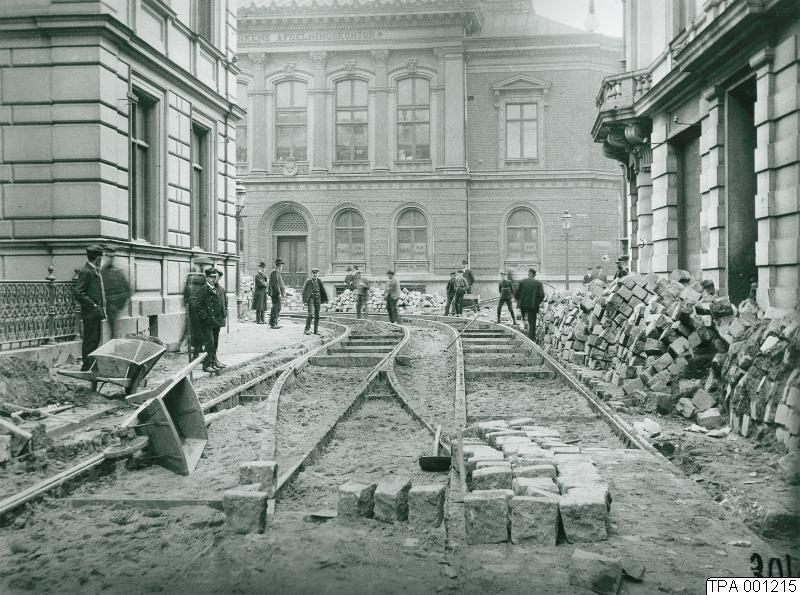 - Anläggningsarbete i samband med elektrifiering av spårvägen 1906-07. Bruksgatan mot söder. Östergatan korsar. Huset i fonden är dåvarande Riksbanken av John Smedberg.