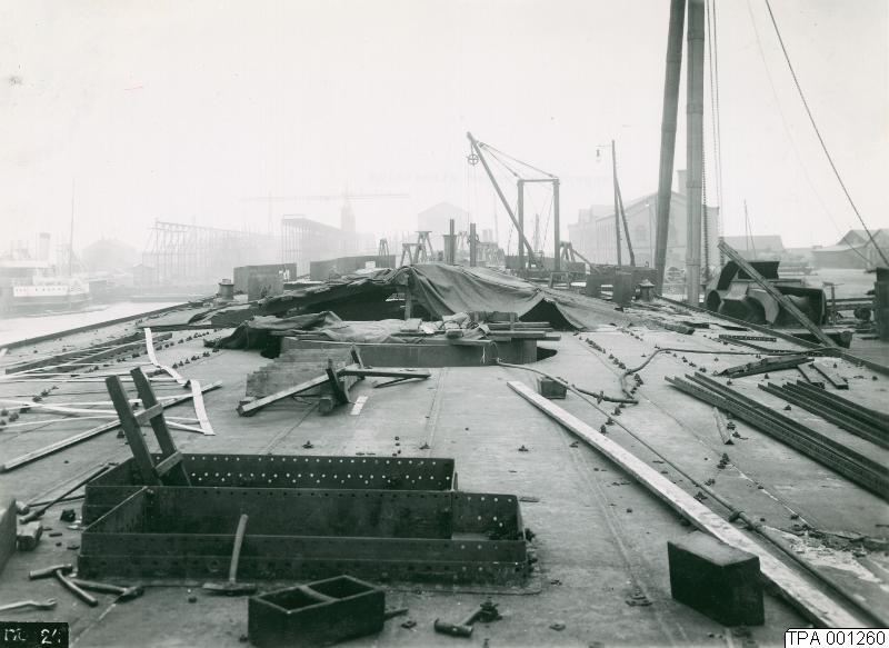 Enligt uppgift är detta HMS "Tapperheten" som utrustas på Kockums mekaniska verkstad. Skeppet sjösattes 1901.