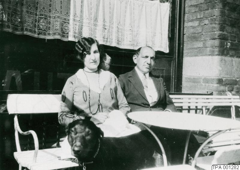 Uteserveringen på automatrestaurangen Vega. Sittande ägarinnan fru Zaar och en oidentiferad man. Hund i förgrunden.