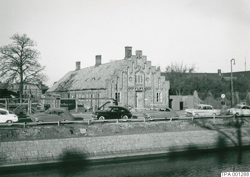 - Västra Hamnkanalen, Fiskehamnsgatan. Byggnaderna ligger i kvarteret Sillen. Byggnaden med de tre skorstenarna (Väktarbostället) kom senare att ingå i Sjömansgården. Bild tagen i januari 1961. I bakgrunden skymtar Skånska Cementgjuteriets (SCG) huvudkontor. Bilden är tagen från Norra Vallgatan.