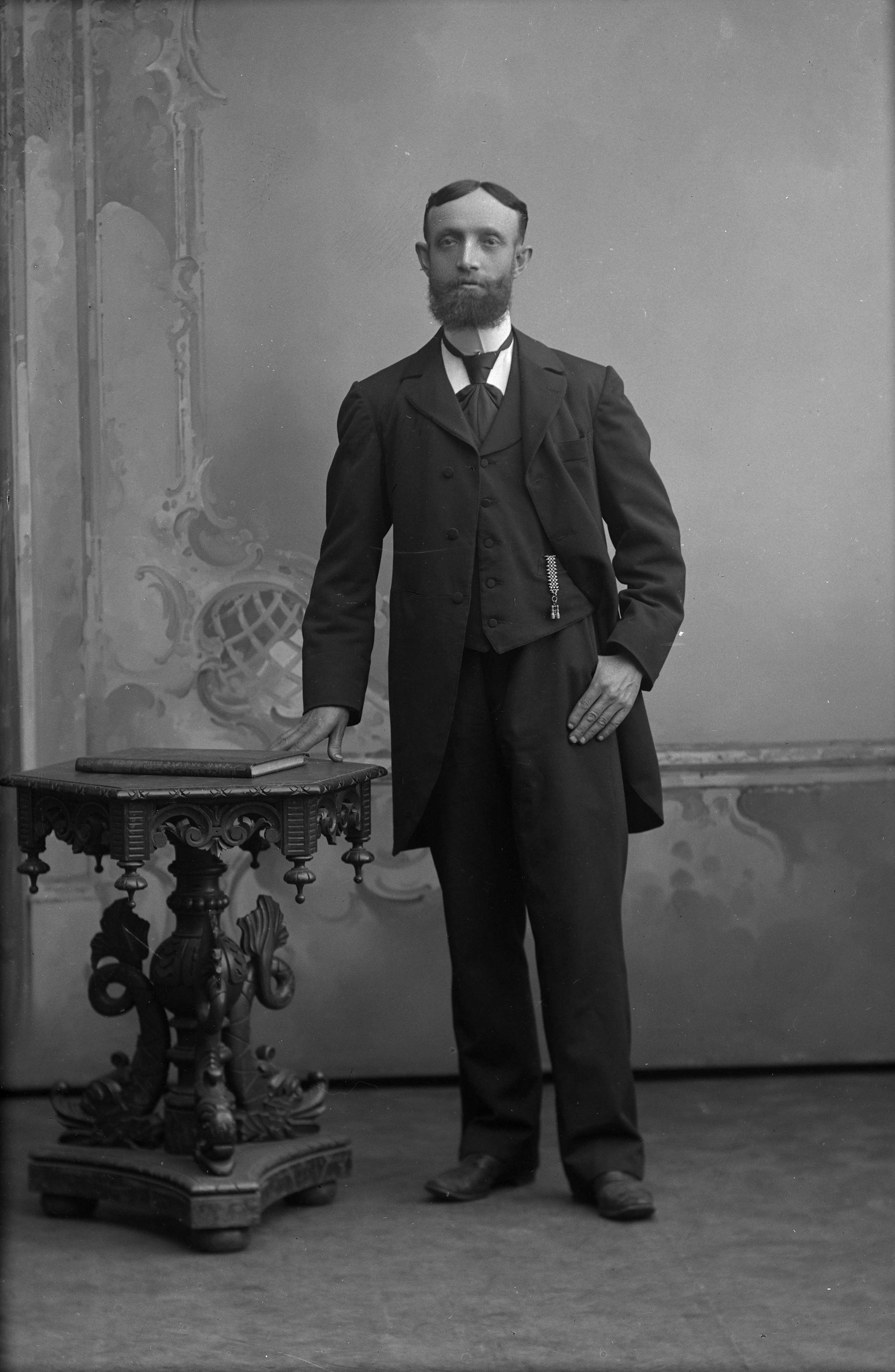 Porträtt i helfigur av H. Fichter, stående vid skulpterat pelarbord (i nyrenässans). På bordet ligger en bok.