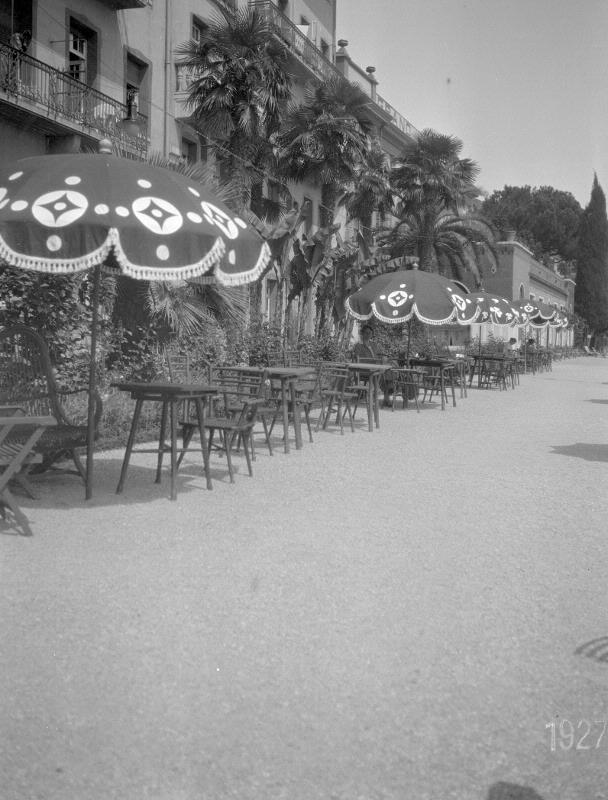Italien, Gardasjön 1927: Gardone Riviera, Grand hotel - gatubild, uteservering