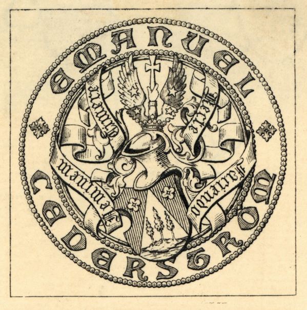 Gråsvart tryck på vitt papper. Vapen. Text: Neminem Timere Recte Faciendo